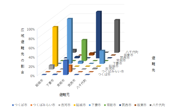 • 対象自治体から広域避難した場合の避難先自治体の割合の算出: 避難先となる市町村ごとに集計し、割合を算出した。分析対象河川の隣接市町の結果を3Dの縦棒グラフで表した。(図11)