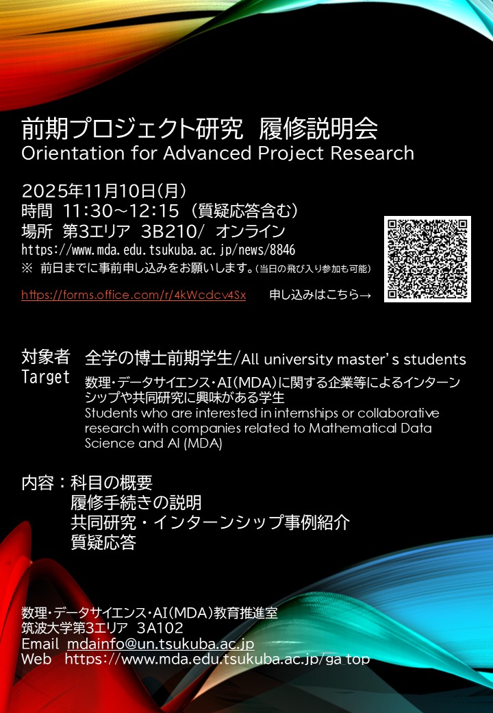 対象者は、全学の博士前期課程の学生です。特に、数理・データサイエンス・AI(MDA)に関する企業によるインターンシップや共同研究に興味ある方はふるってご参加ください。