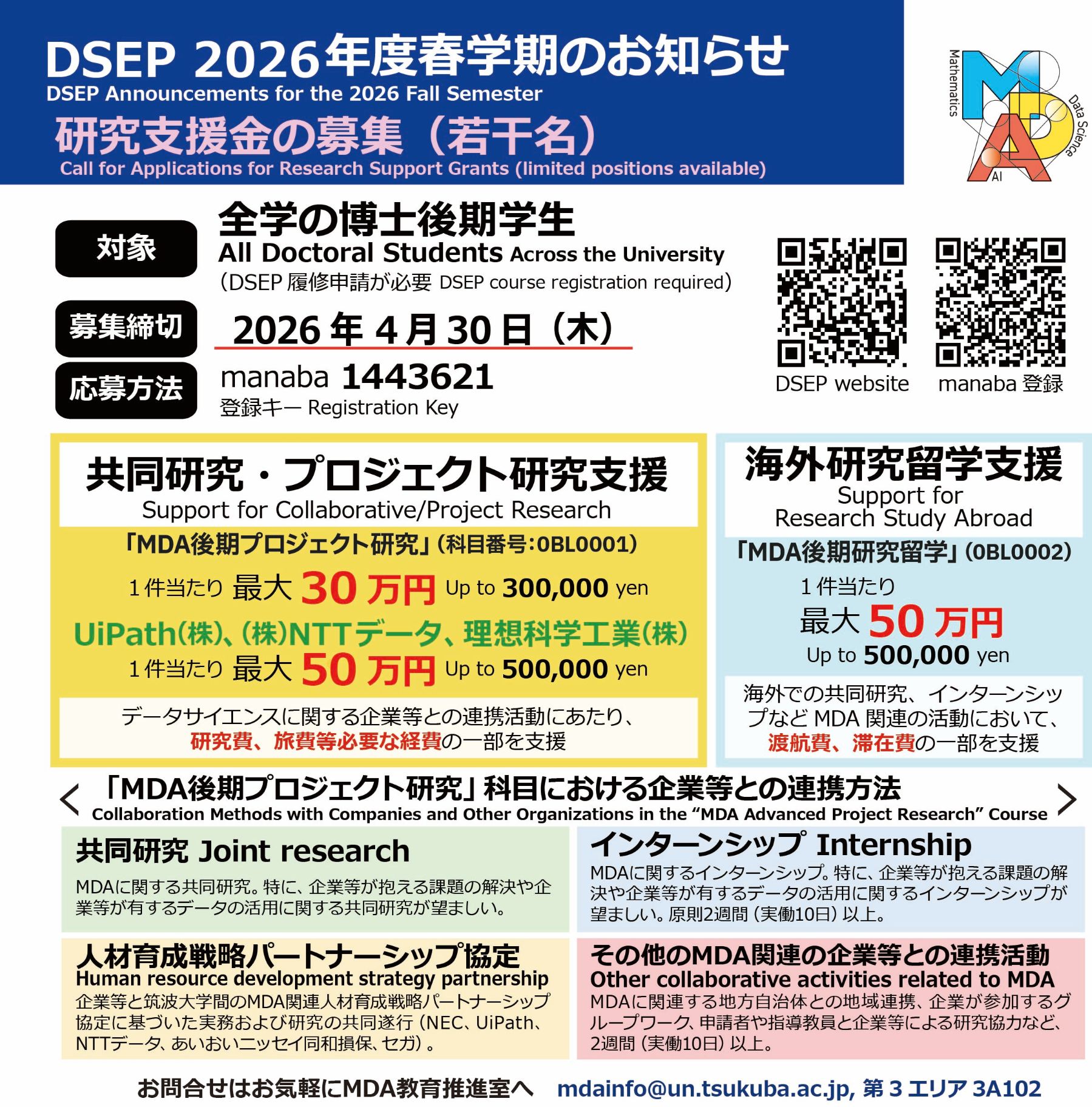 データサイエンス・エキスパート・プログラム(DSEP)で開講しているMDA後期プロジェクト研究MDA後期研究留学は、前者は国内、後者は海外の、共同研究やインターンシップ等の活動に対する科目です。